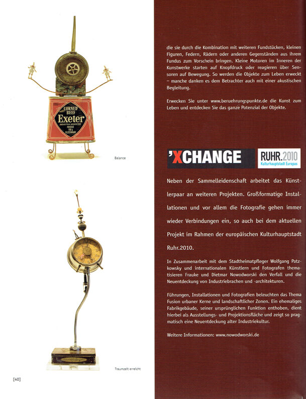Oft sind die einzelnen Fundstücke für sich schon kleine Kunstwerke. Schrammen, Beulen und Gebrauchsspuren erzählen von einem zweckbestimmten Vorleben. Frauke und Dietmar Nowodworski gucken genau hin undentdecken darüber hinaus verborgene Qualitäten, die sie durch die Kombination mit weiteren Fundstücken, kleinen Figuren, Federn, Rädern oder anderen Gegenständen aus ihrem Fundus zum Vorschein bringen. Kleine Motoren im Inneren der Kunstwerke starten auf Knopfdruck oder reagieren über Sensoren auf Bewegung. So werden die Objekte zum Leben erweckt – manche danken es dem Betrachter auch mit einer akustische Begleitung.