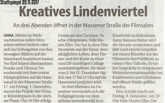 Öffnungszeiten:Oktober 02.10./ 09.10./ 16.10. /23.10./30.10.November 06.11/ 13.11./ 20.11./27.11.Dezember 04.12./11.12./18.12. An diesen Terminen ist das arthaus:nowodworski jeweils von 14.00 bis 17.00 Uhr geöffnet. Der Eintritt …